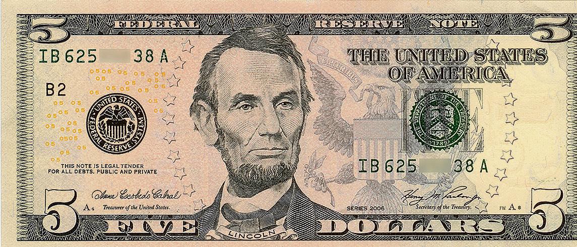 As sete cédulas correntes no país mostram em seu anverso os presidentes George Washington (US$ 1), Thomas Jefferson (US$ 2), Abraham Lincoln (US$ 5), Andrew Jackson (US$ 20) e Ulysses S. Grant (US$ 50), o primeiro- secretário do Tesouro, Alexander Hamilton (US$ 10) e um dos pais fundadores dos EUA, Benjamin Franklin (US$ 100).