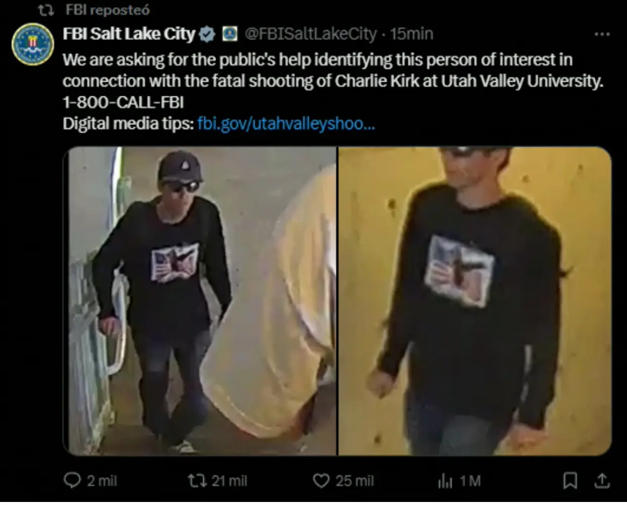 O FBI divulgou na tarde desta quinta-feira (11) uma foto de um indivíduo considerado pelas autoridades uma "pessoa de alto interesse" para as investigações. A agência americana não classificou a pessoa da foto como suspeita, mas solicitou informações sobre o indivíduo por meio do perfil oficial do FBI em Salt Lake City na rede social X.