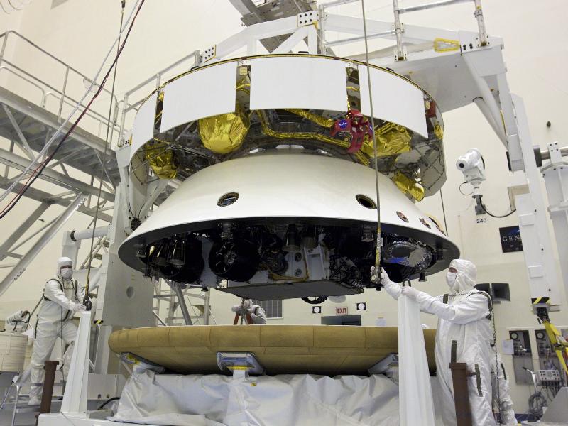 A espaçonave, que tem aproximadamente o tamanho de um carro pequeno, deve ser içada por um guindaste até o topo de um foguete não tripulado Atlas 5 em uma estação da força aérea em Cape Canaveral, disse a porta-voz da Nasa Lisa Malone.