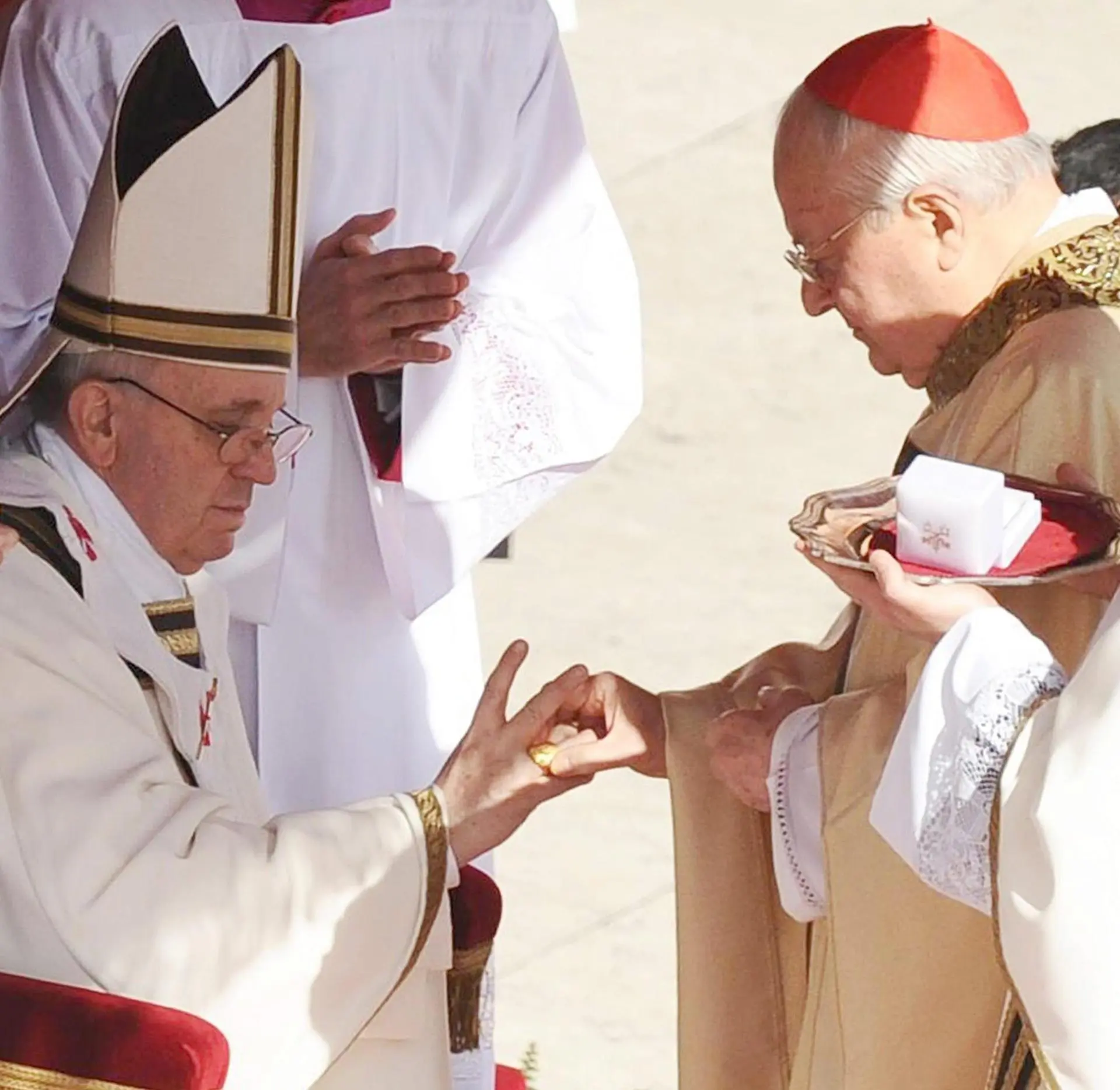 O papa Francisco recebendo seu Anel do Pescador das mãos do cardeal italiano Angelo Sodano, falecido em 2022. A ação, ocorrida durante missa no dia 19 de março de 2013, marcou o início oficial de seu papado, o 266º na história da Igreja Católica. Foto: EFE/Ciro Fusco