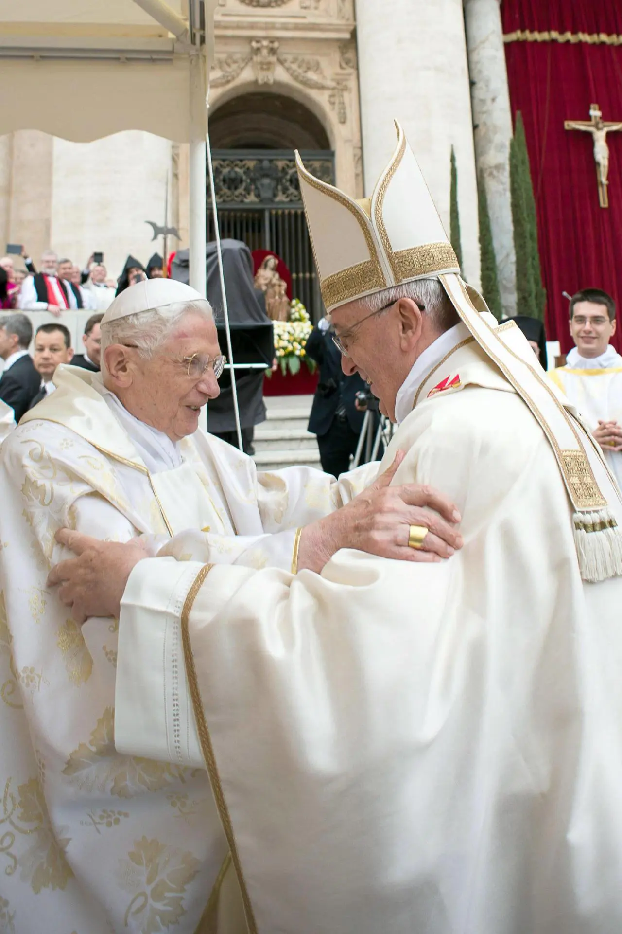 O papa Francisco abraçando o papa emérito Bento XVI durante a missa de canonização dos papas João Paulo II e João XXIII, no Vaticano, em 27 de abril de 2014. Foto: EFE/EPA/OSSERVATORE ROMANO PRESS OFFICE