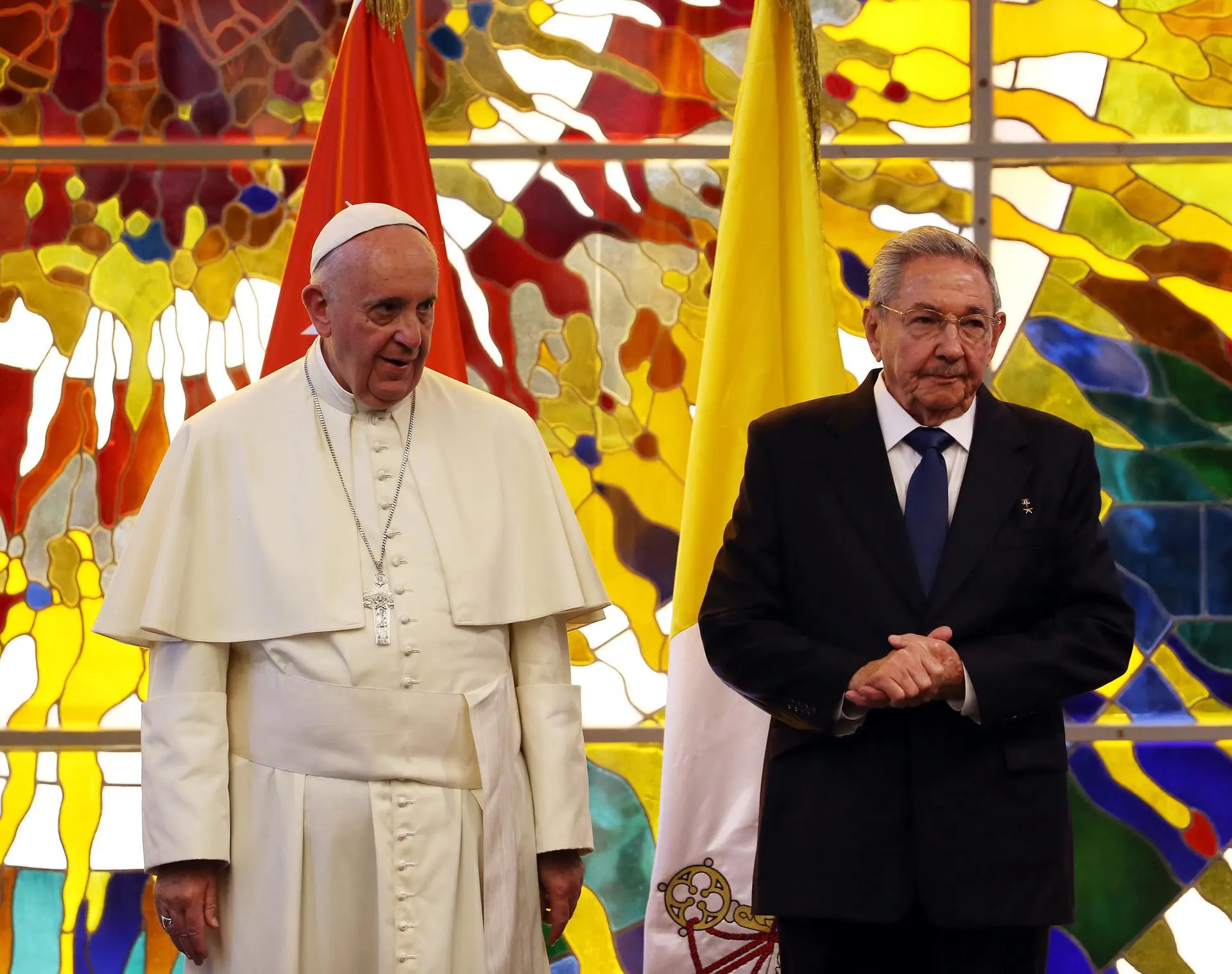 O papa Francisco conversa com o ditador de Cuba, Raúl Castro, no Palácio da Revolução, em Havana, durante sua visita à ilha comunista em 20 de setembro de 2015. Francisco se tornou o terceiro pontífice a visitar Cuba, depois de Bento XVI e São João Paulo II; e também se tornou o primeiro papa a celebrar a missa no Santuário de Nossa Senhora da Caridade do Cobre, Padroeira de Cuba. Foto: EFE/Alejandro Ernesto