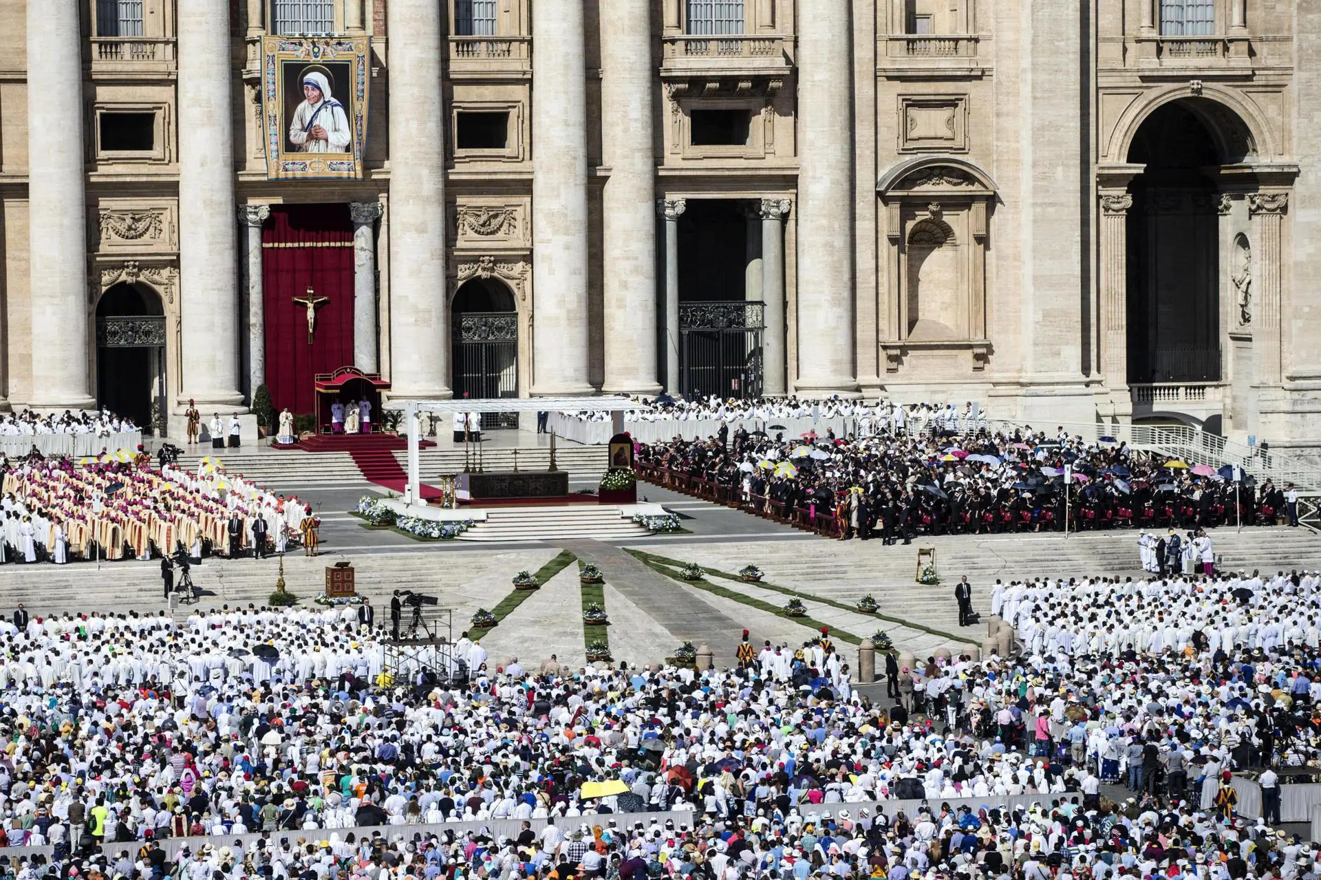 Papa Francisco celebrando missa de canonização de Madre Teresa de Calcutá, no dia 4 de setembro de 2016. Santa Madre Teresa iniciou seu trabalho ajudando os mais necessitados na cidade de Calcutá, na Índia, e ganhou o prêmio Nobel da Paz em 1978. Foto: EFE/EPA/ANGELO CARCONI