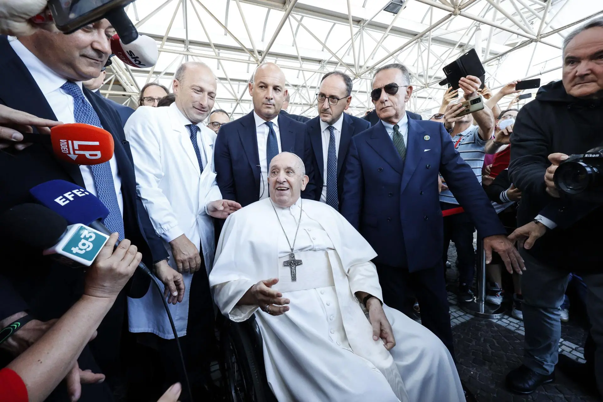 Papa Francisco conversando com jornalistas em junho de 2023, após ser liberado do hospital Gemelli, onde foi submetido a uma cirurgia no abdômen, para a tratar de uma laparocele. EFE/EPA/FABIO FRUSTACI