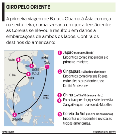 Na semana em que o conflito entre as Coreias ficou mais tenso, o presidente Barack Obama parte para um giro pela Ásia de nove dias. Ele visita o Japão amanhã e sexta, e depois segue para Cingapura, China e Coreia do Sul.