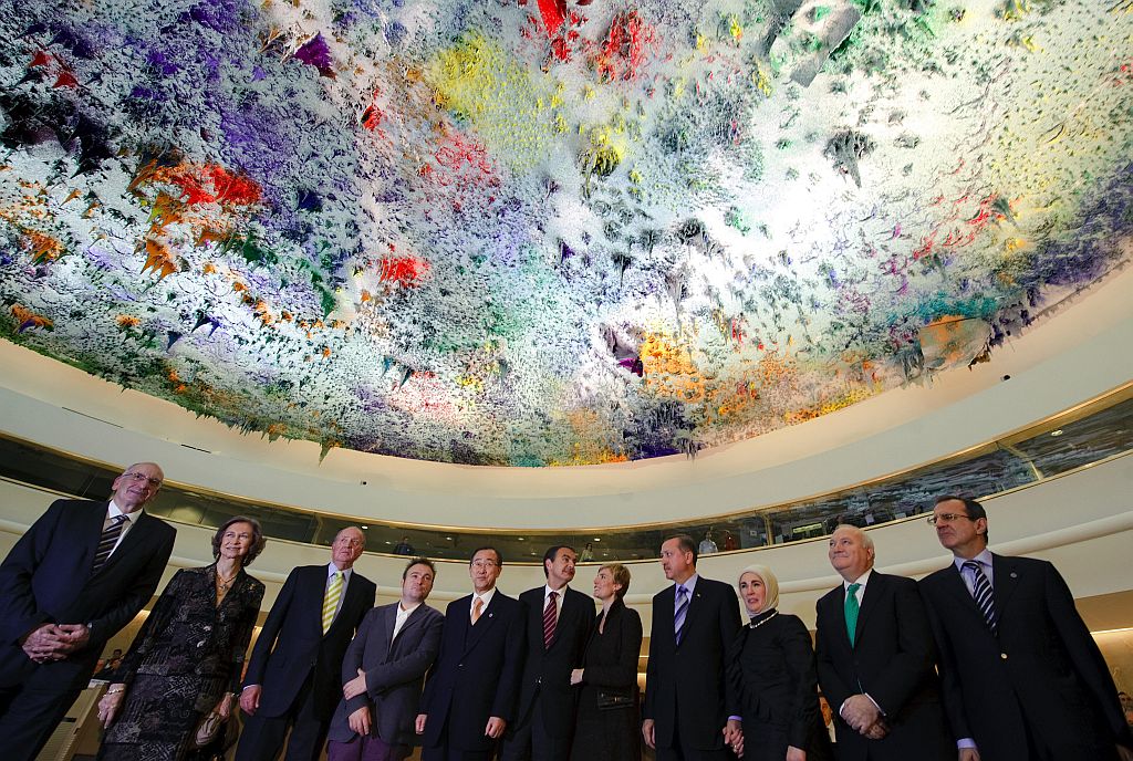 A Organização das Nações Unidas (ONU) inaugurou nesta terça-feira (18) em sua sede em Genebra, a pintura do teto de uma sala de reuniões que causou polêmica pelos investimentos que consumiu. Em meio à crise internacional e à dificuldade da própria organização para obter recursos, a obra foi orçada em US$ 23 milhões. Um domo elíptico de 1,5 mil metros quadrados foi pintado com cores brilhantes, em um trabalho do espanhol Miquel Barceló que levou um ano para ficar pronto. Engenheiros, arquitetos e até físicos trabalharam para desenvolver os materiais usados na obra, que se assemelha a estalactites multicoloridas.