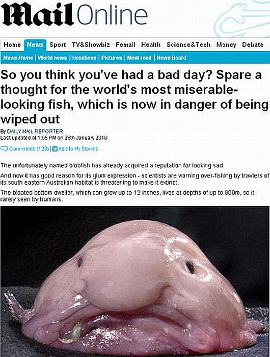 O peixe da espécie Psychrolutes marcidus, conhecido por blobfish e por uma cara que dá pena, está em risco de extinção. A informação está no site do jornal britânico "Daily Mail". O hábitat da criatura é a costa sudeste da Austrália, em águas profundas. A risco de extinção vem do excesso de pesca por traineiras, barcos de pesca que fazem uso de redes de arrastão para amealhar suas vítimas.
