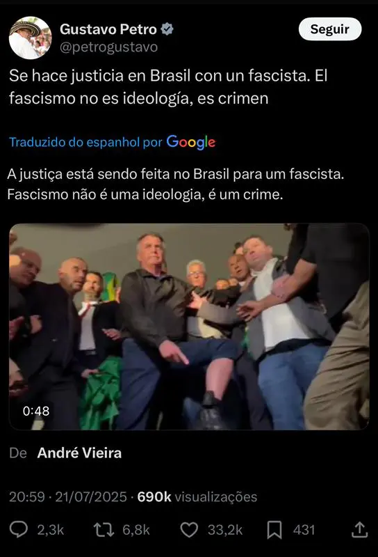 O vídeo publicado por Petro é de segunda-feira (21), quando o ex-presidente brasileiro se dirigiu ao Congresso para participar de uma reunião com parlamentares da oposição na Câmara dos Deputados. Na ocasião, o ex-mandatário afirmou que o uso da tornozeleira eletrônica representa a “máxima humilhação”.