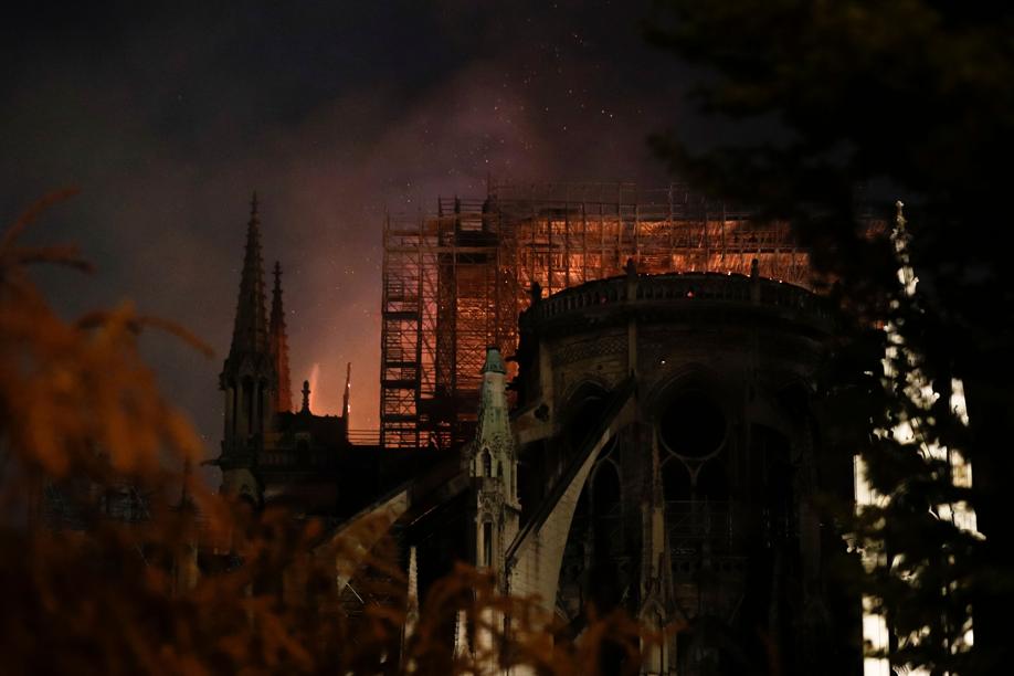 Mais cedo, a queda da enorme flecha que ficava no topo da catedral foi capturada em vídeo. Um correspondente da agência de notícias Reuters que estava no local afirmou que todo o teto da catedral colapsou, por volta das 20 horas (no horário local, 15 horas em Brasília).