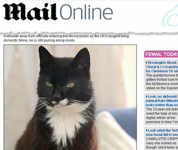 Com 27 anos, o gato Mischief já é considerado o bichano mais velho da Inglaterra. Mas o título ainda não é oficial, pois essa categoria no livro "Guinness" pertence a Willow, um gato que viveu 26 anos em Shrewsburry. O mais velho do mundo foi Creme Puff, do Texas, que chegou aos 38 anos.