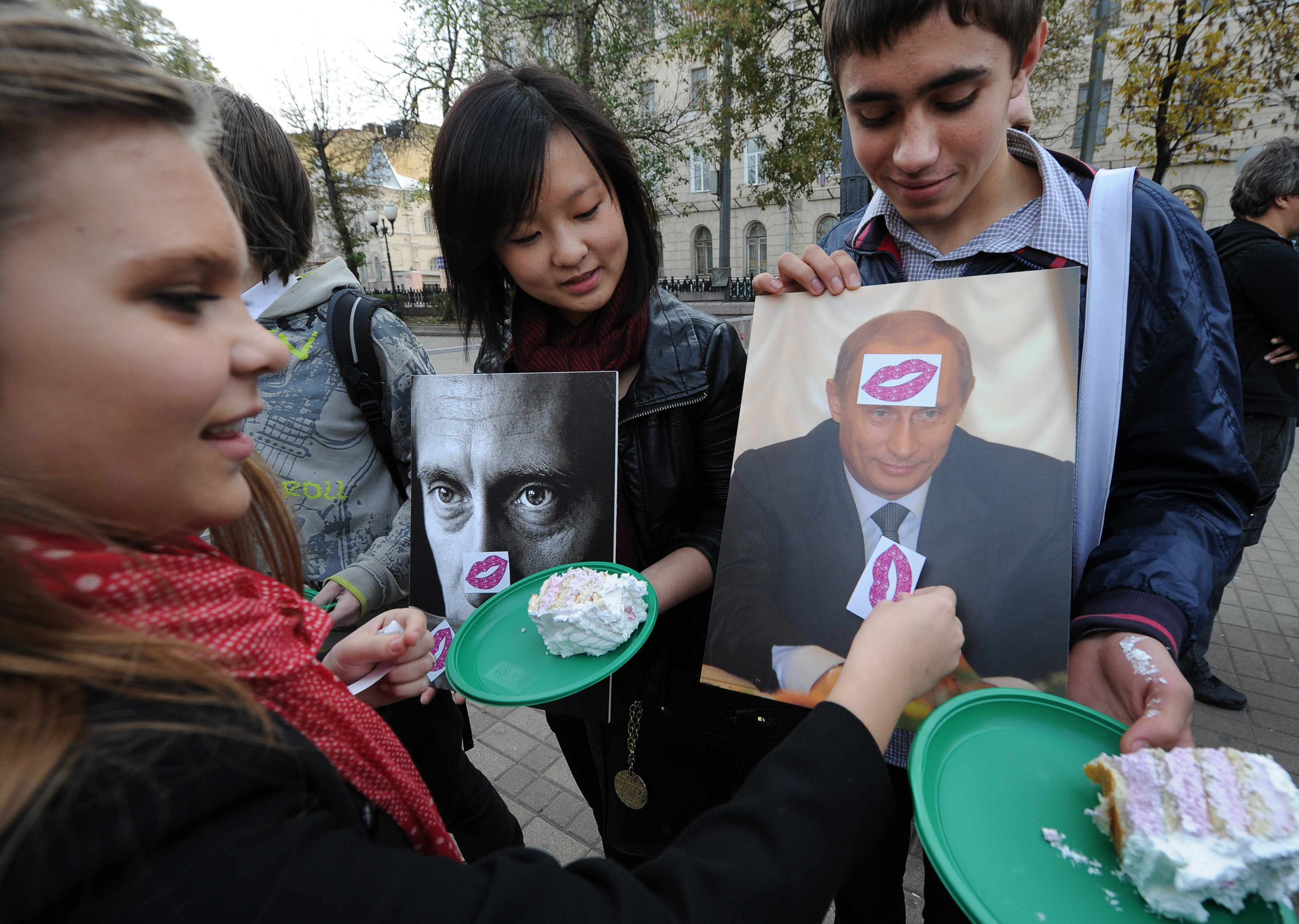 Depois se reuniram em uma praça de Moscou para propor aos transeuntes deixassem marcas de beijos nos retratos de Putin.