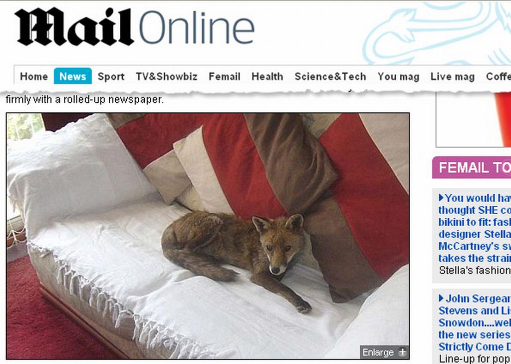O britânico Ian Young, 77, deixou a porta de sua casa aberta quando foi trabalhar no quintal. Na volta, ele encontrou uma raposa aconchegada em seu sofá, onde dormia. O animal, afirmou o jornal "Daily Mail", acordou quando Young disparou o flash da câmera fotográfica, mas não saiu de onde estava confortavelmente instalado. A raposa só se mexeu quando o proprietário da casa usou um jornal enrolado para assustá-lo.
