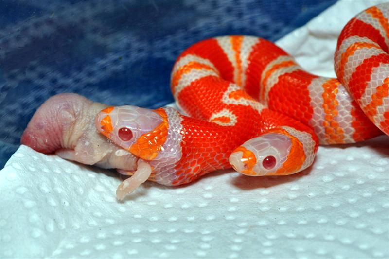 Uma cobra falsa coral (Lampropeltis Triangulum Hondurensis) de duas cabeças que nasceu em outubro, em uma incubadora na Flórida, fez nesta segunda-feira (21) sua primeira refeição: um filhote de rato morto.