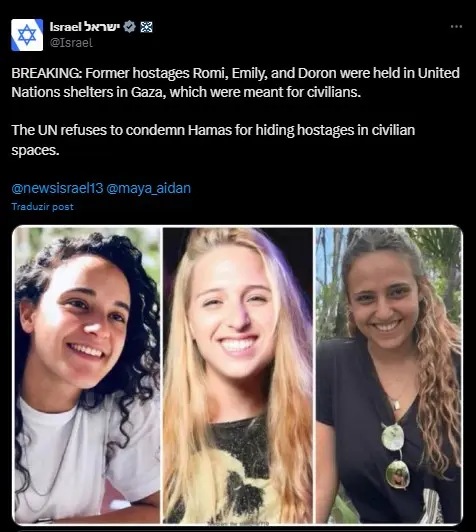 “As ex-reféns Romi, Emily e Doron foram mantidas em abrigos das Nações Unidas em Gaza, que deveriam ser destinados a civis”, diz o post.