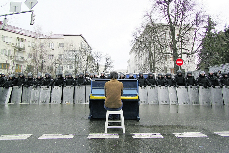 Uma das imagens mais impactantes do fotógrafo ucraniano Markiyan Matsekh é a de um pianista tocando Chopin na frente de 500 policiais do batalhão de choque. Trata-se de uma imagem que acabou se tornando uma espécie de símbolo da paz e dos protestos.