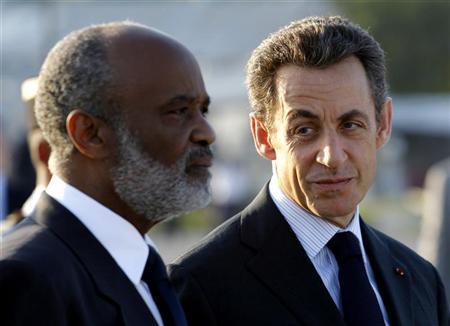 Sarkozy fez um discurso após chegar à capital Porto Príncipe na primeira visita de um chefe de Estado francês à ex-colônia francesa.