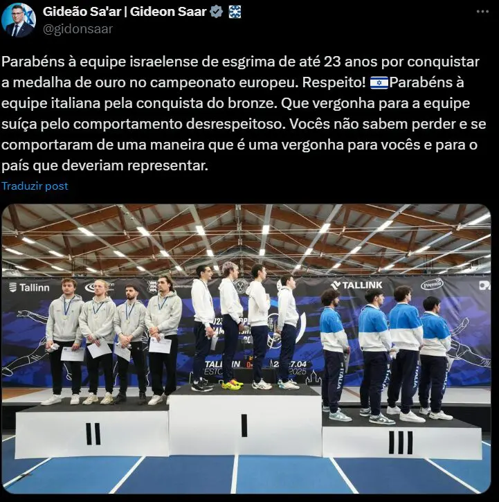 "Parabéns à equipe israelense de esgrima de até 23 anos por conquistar a medalha de ouro no campeonato europeu. Respeito! Parabéns à equipe italiana pela conquista do bronze. Que vergonha para a equipe suíça pelo comportamento desrespeitoso. Vocês não sabem perder e se comportaram de uma maneira que é uma vergonha para vocês e para o país que deveriam representar", disse.