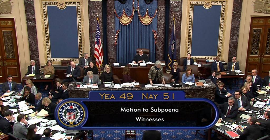 Os senadores dos Estados Unidos decidiram nesta sexta-feira (31) não convocar novas testemunhas para depor ou aceitar novas evidências para o processo de impeachment contra o presidente Donald Trump. Com resultado de 49 a 51, a moção proposta pelos democratas foi derrubada. Após essa decisão, o Senado deve prosseguir com a votação dos dois artigos de impeachment na próxima semana.