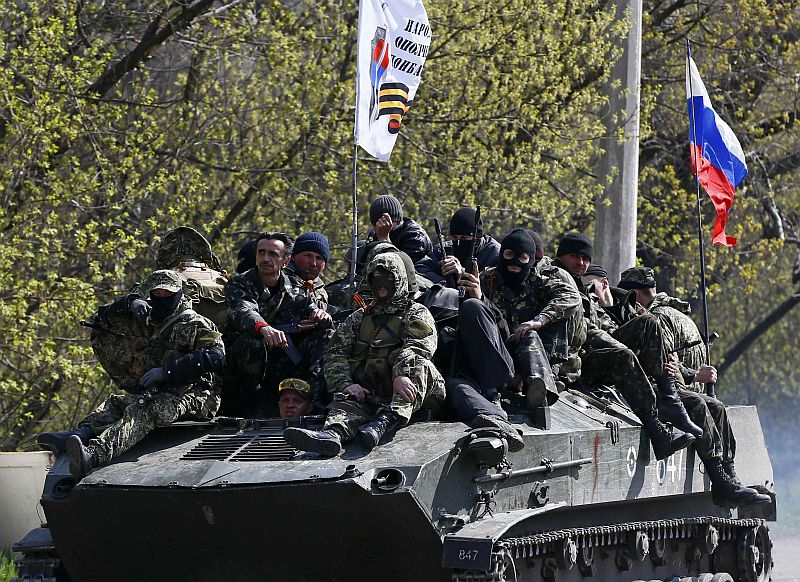 Seis blindados para transporte de tropas foram levados para Slaviansk, cidade tomada pelos rebeldes, aos acenos e gritos de "Rússia! Rússia!". Não ficou claro de imediato se os veículos foram capturados pelos rebeldes ou entregues a eles por desertores ucranianos.