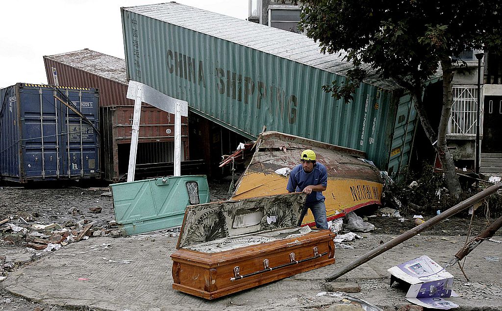 Em Constitución, localidade litorânea 360 quilômetros ao sul de Santiago, equipes de resgate com cães se concentram nas buscas por cadáveres, que são empilhados num ginásio desportivo.