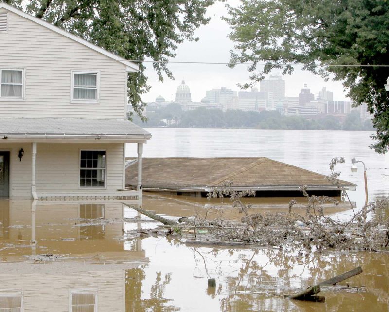 Casa em frente ao Rio Susquehanna foi atingida pela enchente, em West Fairville, Pensilvânia. Mais de 100 mil moradores tiveram que deixar suas casas e três pessoas morreram. Foi decretado estado de emergência na região. Desde 1972 não havia temporais tão fortes na região. As chuvas ainda são resultado da tempestade tropical Lee, que atingiu também a Nova Inglaterra e a Costa do Golfo, onde inundou casas e empresas. O Serviço Meteorológico Nacional americano lançou uma advertência de que podem ocorrer outras inundações súbitas.