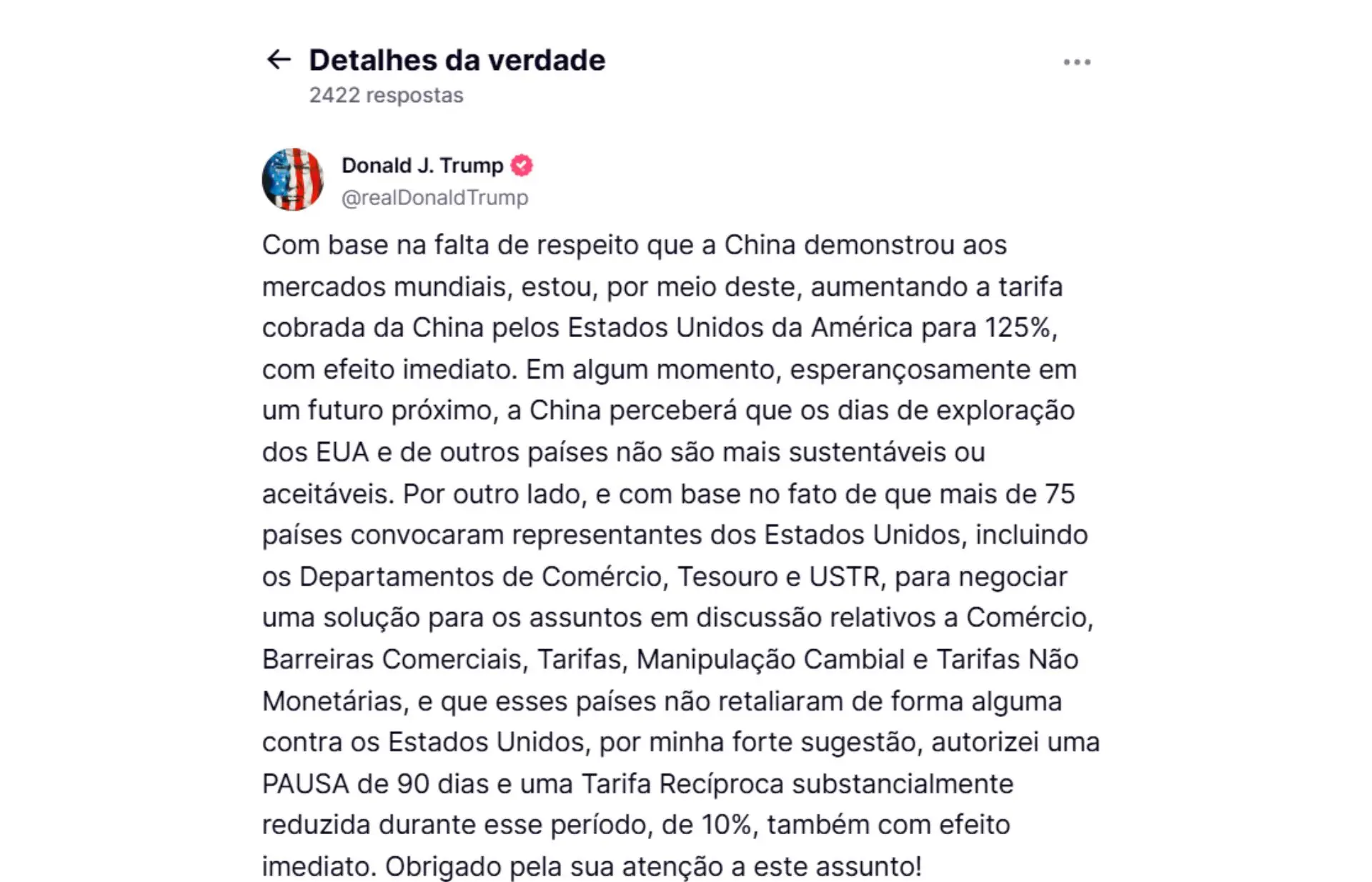 O mandatário informou na Truth Social que "autorizou uma PAUSA de 90 dias e uma Tarifa Recíproca substancialmente reduzida durante esse período, de 10%, também com efeito imediato".