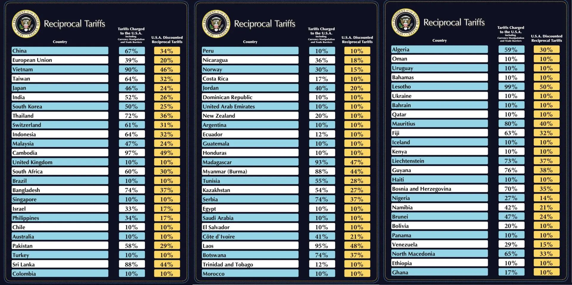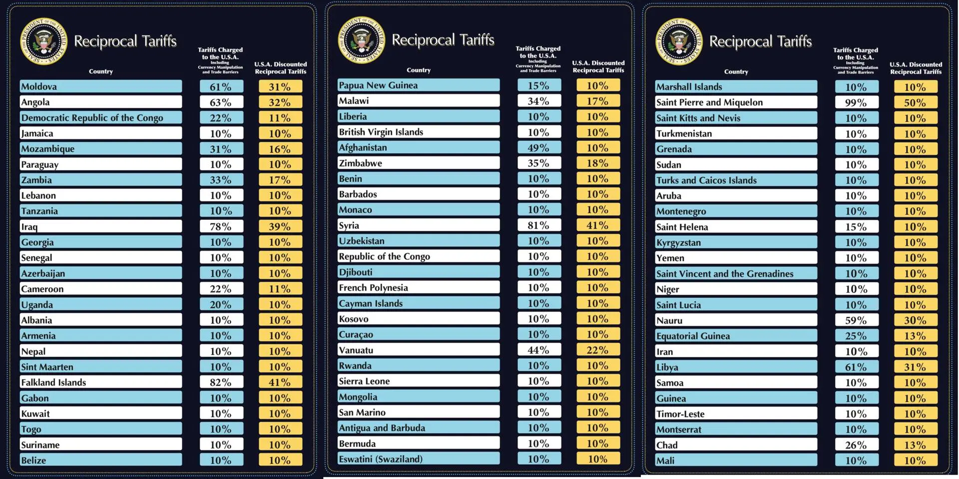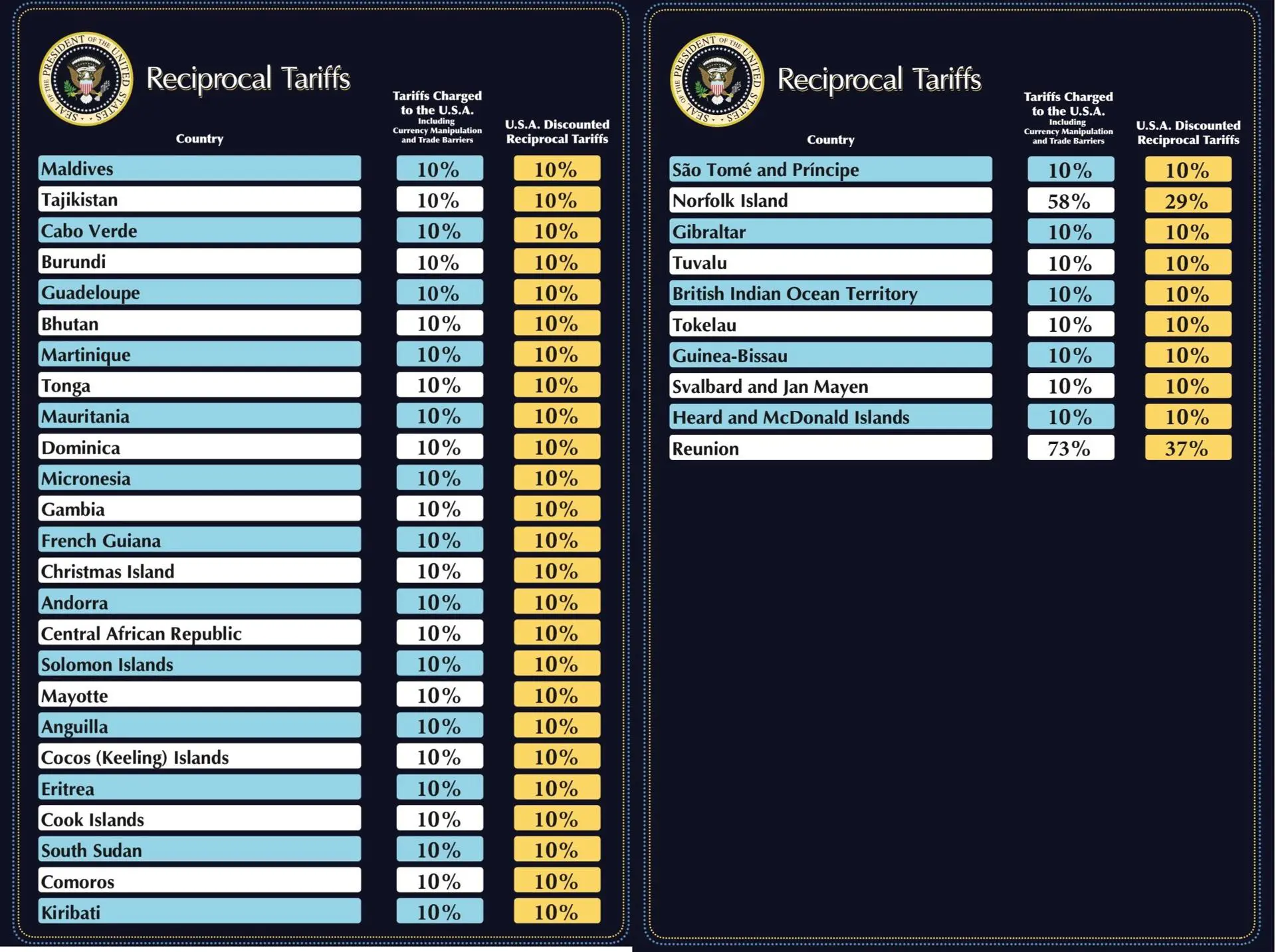 De acordo com a planilha divulgada, o Lesoto, país no sul do continente africano, junto ao território de São Pedro e Miquelão, foram os Estados mais afetados pelas tarfias anunciadas, sendo taxados em 50%.