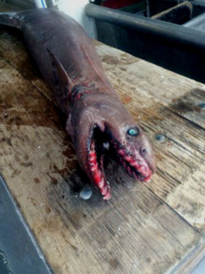 Este tubarão, cuja espécie parece existir há cerca de 80 milhões de anos, tem a cabeça e a cauda como as de um tubarão, embora seu corpo seja mais parecido ao de uma enguia, e possui cerca de 300 dentes repartidos em 25 fileiras.