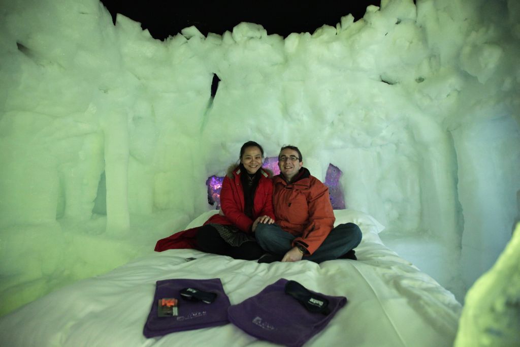 Trabalhadas num único bloco de gelo, as camas apresentam reflexos azuis, rosas e verdes transmitidos pelas lâmpadas instaladas no gelo.