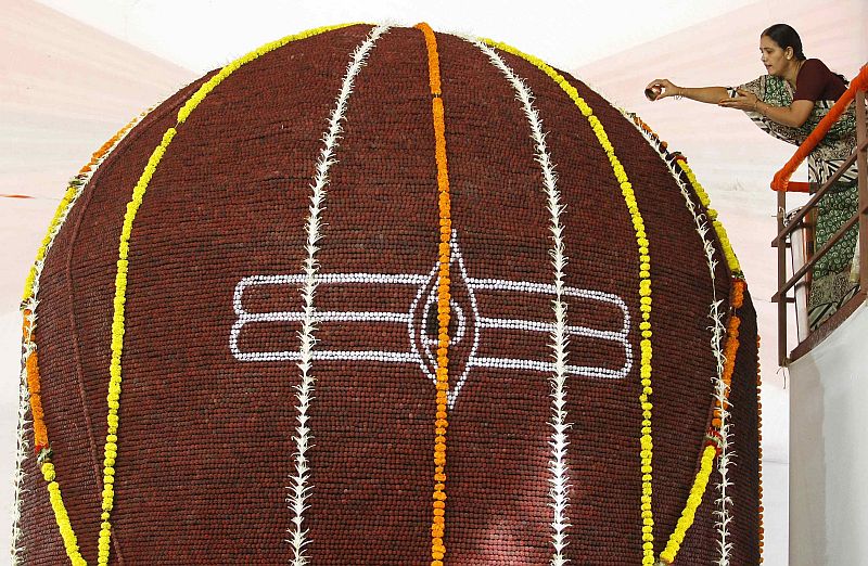 Mulher hindu pinga leite como oferenda em monumento gigante ao deus Shiva, durante o mês sagrado do Shravan, em templo a oeste de Ahmebadab, na Índia