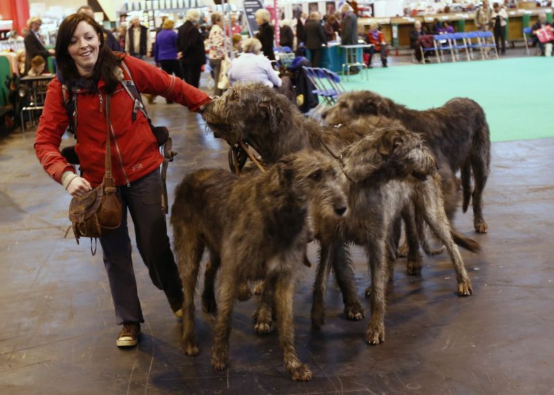 Uma mulher luta para conseguir controlar quatro cães da raça Lébrel Irlandês durante o primeiro dia da feira Crufts Dog Show, na cidade de Birmingham, na Inglaterra