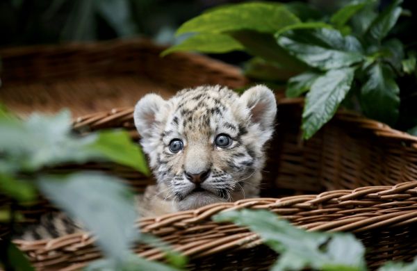 Alisha, o filhote de cinco semanas de um tigre siberiano, olha para fora de uma cesta e é apresentada no zoo Tierpark Friedrichsfelde, em Berlim (Foto: REUTERS/Fabrizio Bensch)