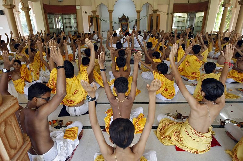 Jovens participam de celebração religiosa em templo no oeste da Índia, em Ahmedabad