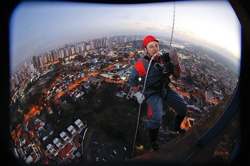 Bombeiro faz rapel em torre de companhia telefônica em Curitiba, Paraná. A torre tem quase 110 metros de altura