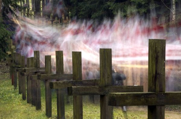 Fotografia feita com longa exposição de pessoas caminhando entre cruzes numa missa em Kuropaty em memória das vítimas do ditador russo Joseph Stalin, nos arredores de Minsk, na Bielorrússia (Foto: Vasily Fedosenko/Reuters)
