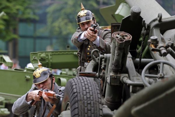Os 100 anos da Primeira Guerra Mundial são relembrados por homens fardados com uniformes originais em Bucareste, na Romênia. Eles também simularam uma batalha da época (Foto: Bogdan Cristel/Reuters)