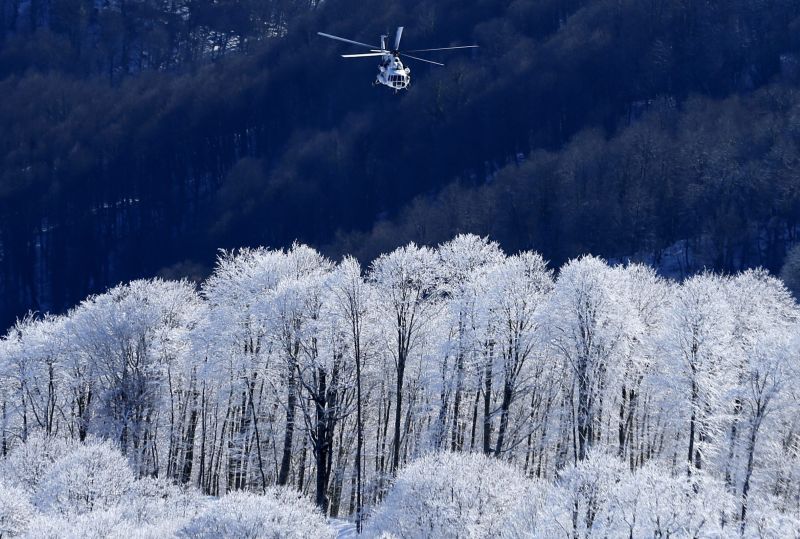 Helicóptero sobrevoa montanha em Rosa Khutor, na Rússia, durante preparação do local para os Jogos Olímpicos de Inverno de Sochi (Foto: REUTERS/Mike Blake)