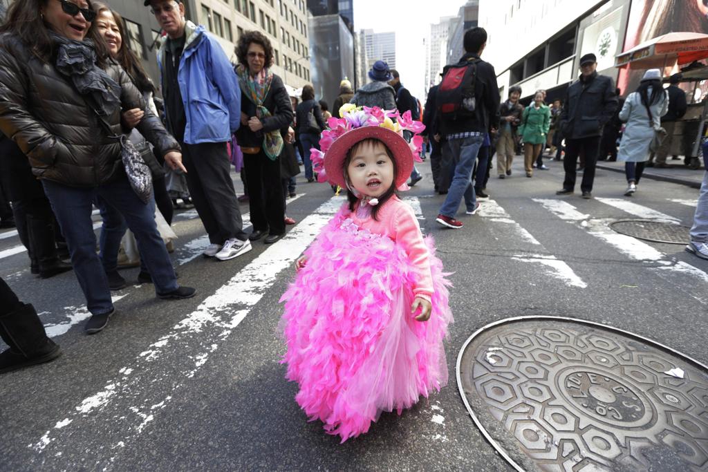 Criança com fantasia de plumas participa da Parada da Páscoa em Nova York.