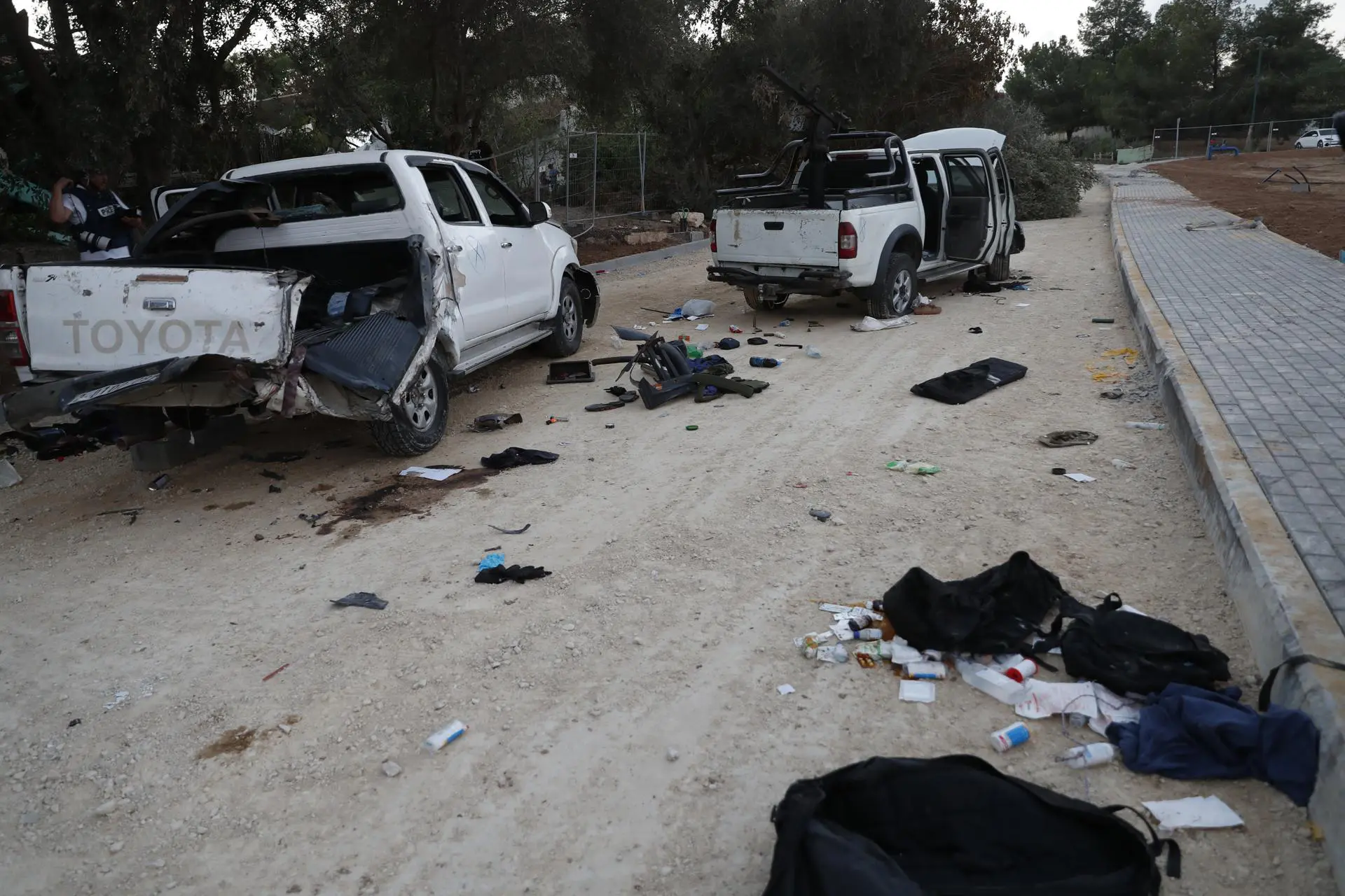 Carros usados por terroristas do Hamas em Be'eri, Israel, 11 de outubro de 2023. De acordo com autoridades, 108 corpos israelenses foram encontrados no kibutz Be'eri, perto da fronteira com Gaza. Crédito: EFE/EPA/ATEF SAFADI