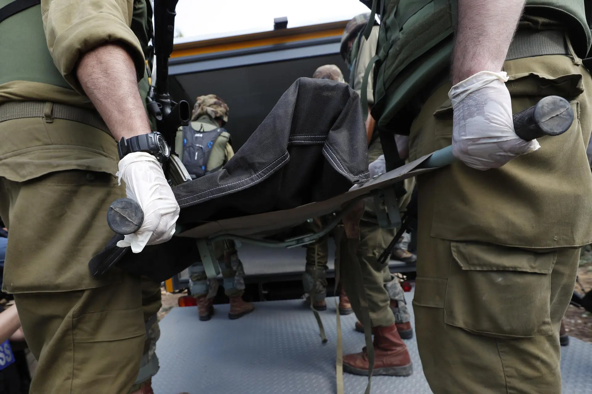 Soldados israelenses pegam os corpos de israelenses mortos no kibutz de Kfar Aza, perto da fronteira com Gaza, em 10 de outubro de 2023. Crédito: EFE/EPA/ATEF SAFADI (Foto: EFE)
