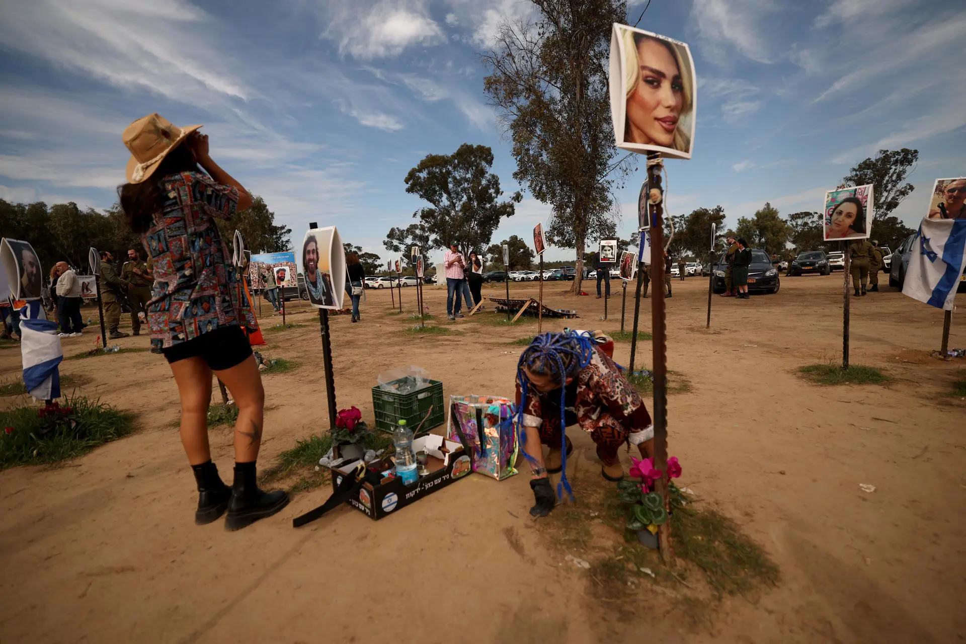 Parentes dos assassinados no Festival de música Nova plantam árvores em memória das vítimas, no local perto do kibutz Re'im, próximo à fronteira com Gaza, no sul de Israel. Crédito: EFE/EPA/ATEF SAFADI (Foto: EFE)