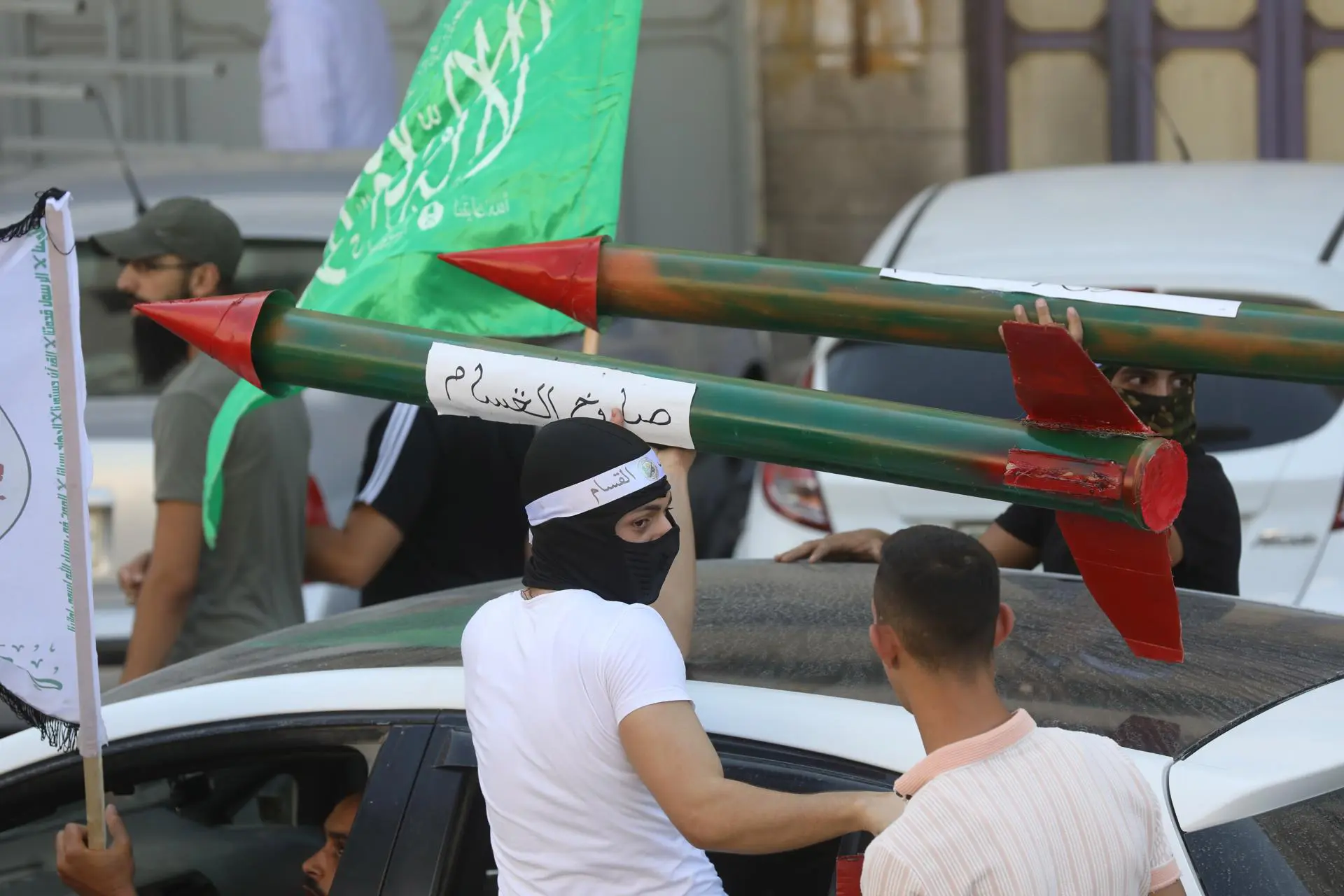 Palestinos carregam foguetes falsos durante um protesto em apoio a Gaza na cidade de Nablus, na Cisjordânia, em 13 de outubro de 2023. Crédito: EFE/EPA/ALAA BADARNEH (Foto: EFE)