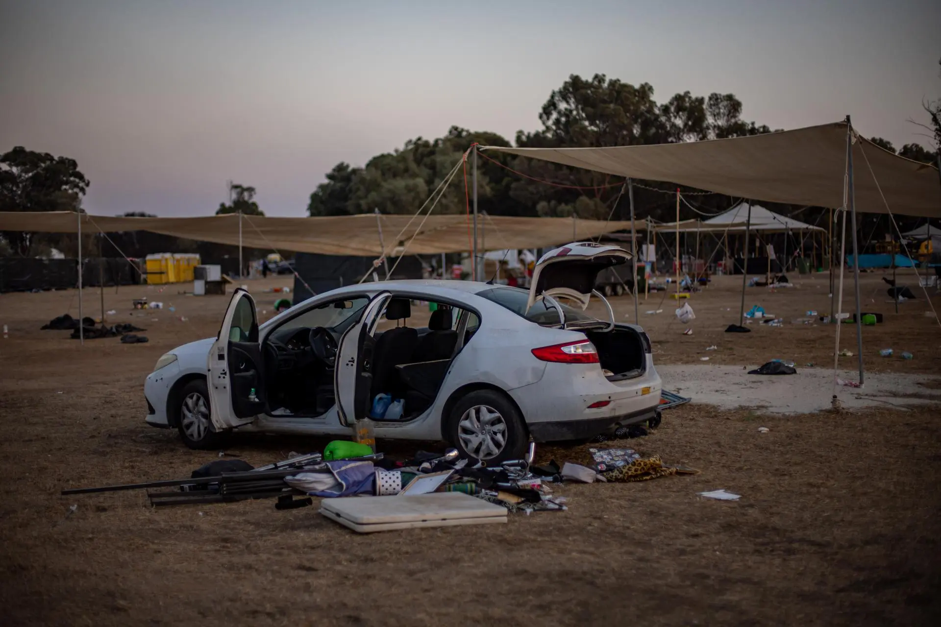 Carro deixado para trás por israelenses após ataque terrorista que matou mais de 260 pessoas no Festival de música Super Nova em 7 de outubro, perto de Raim, Israel, no ano passado. Crédito: EFE/EPA/MARTIN DIVISEK (Foto: EFE)