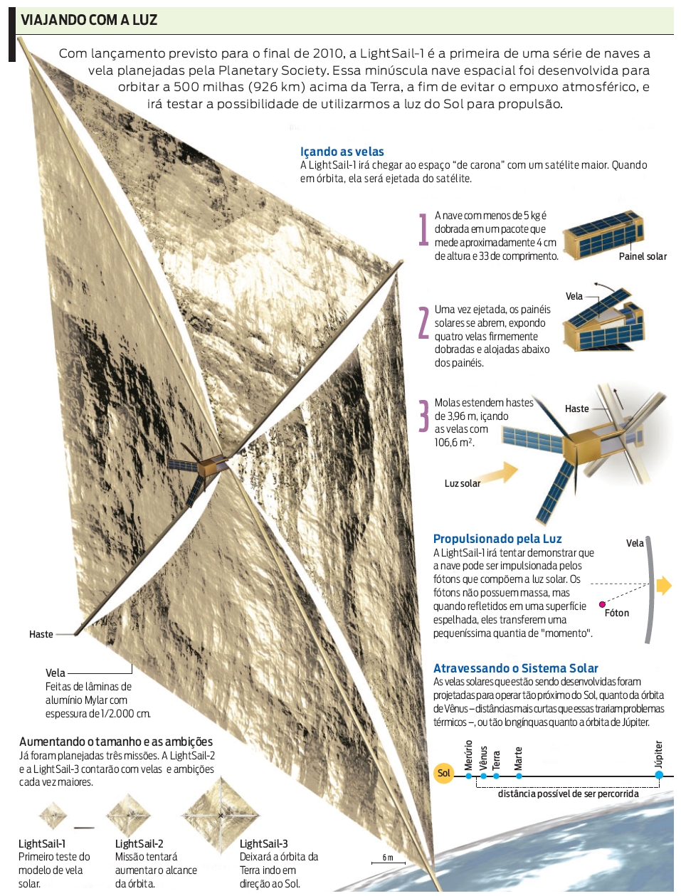Pasadena, Califórnia - Até o fim do próximo ano, se tudo correr bem, uma caixa do tamanho de um pão caseiro irá sair de um foguete numa altura de 500 milhas (926 km) a partir da Terra. Lá, no vácuo, essa caixa irá hastear quatro velas triangulares capazes de captar os raios solares e viajar no espaço.
