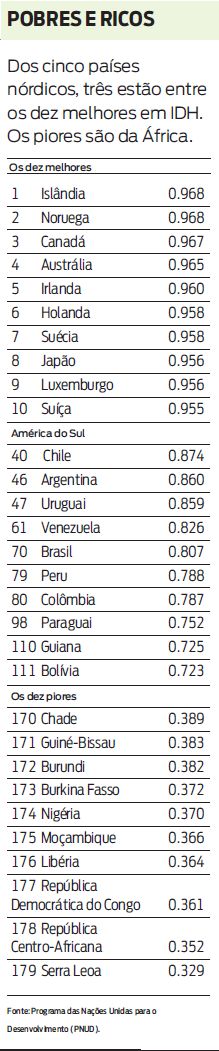 O Brasil se manteve na 70ª posição no ranking do Índice de Desenvolvimento Humano (IDH), divulgado ontem. O levantamento leva em conta dados socioeconômicos de 179 países, e o índice varia de 0 a 1. Quanto mais próximo de 1, melhor é o resultado.