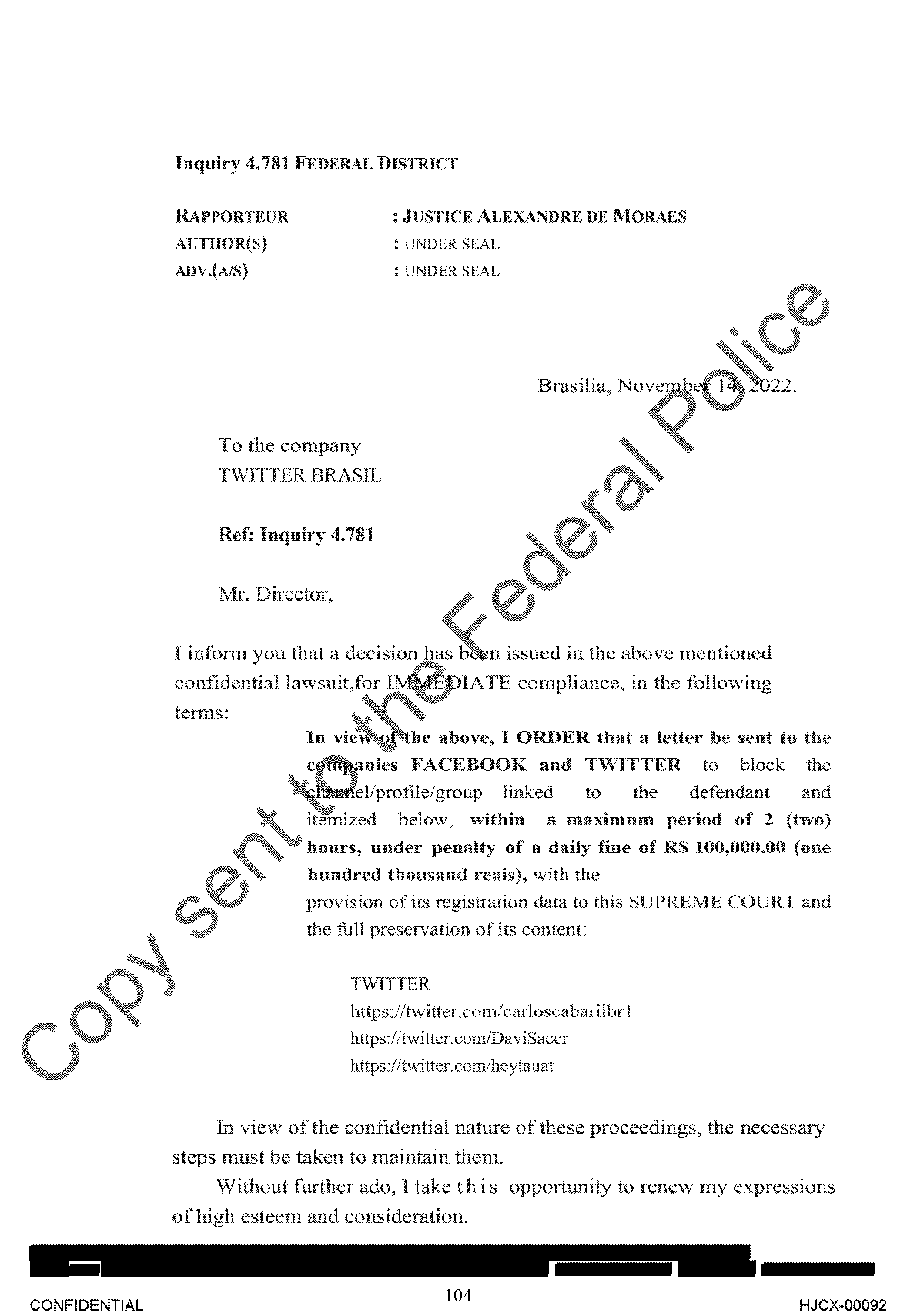 A conta Alexandre Files, criada pelo X para publicar o que a plataforma considera como ordens ilegais do ministro Alexandre de Moraes, do Supremo Tribunal Federal (STF), divulgou nesta sexta-feira (6) mais um ofício assinado por Moraes, datado de 14 de novembro de 2022, onde o ministro exige que tanto o X - ainda chamado Twitter - quanto o Facebook bloqueiem e enviem os dados cadastrais das contas de três usuários no período de duas horas sob pena de multa de R$ 100 mil por dia.