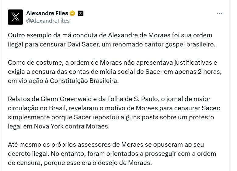 “Outro exemplo da má conduta de Alexandre de Moraes foi sua ordem ilegal para censurar Davi Sacer, um renomado cantor gospel brasileiro”, citou a conta ao compartilhar o ofício do ministro do STF. “Como de costume, a ordem de Moraes não apresentava justificativas e exigia a censura das contas de mídia social de Sacer em apenas 2 horas, em violação à Constituição Brasileira”, pontua.
