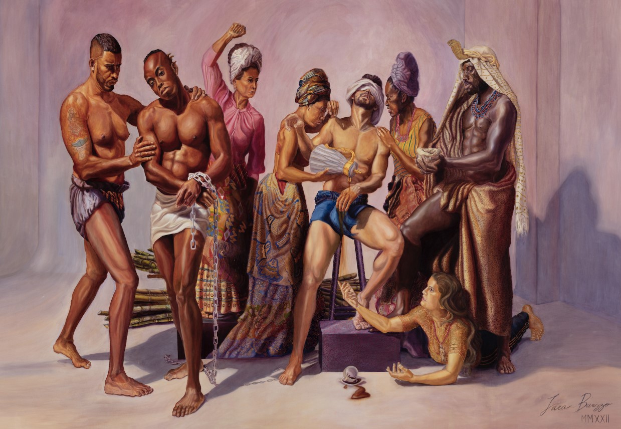 Aquilo que os Evangelhos narraram, Bach interpretou em música e a cinematografia em drama, uma moça de Curitiba com atrevimento juvenil recentemente representou em tinta. O conjunto de quinze telas da artista plástica Lara Baruzzo evoca as passagens da Via Crucis num contexto em que o sofrimento do negro no Brasil se mistura à condenação de Cristo em Israel.