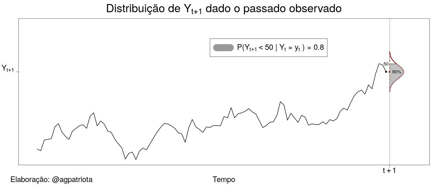 A figura 2 ilustra a distribuição de probabilidades de um valor futuro Yt+1 dado o histórico observado. No caso ilustrado na figura 2, a probabilidade de Yt+1 ser menor do que 50 (unidades de medida) dado todo o histórico² foi estimada ser 80%. Com essa informação o analista pode tomar uma decisão. A curva vermelha destacada na vertical para o ponto no tempo t+1 é a função densidade de probabilidade³ da variável em um futuro próximo (t+1) dado todo o histórico observado. A partir dela, o estatístico consegue calcular probabilidades e intervalos de confiança para o valor futuro. Com essas informações o analista pode tomar alguma decisão importante como, por exemplo, vender o ativo no preço atual ou comprar mais.