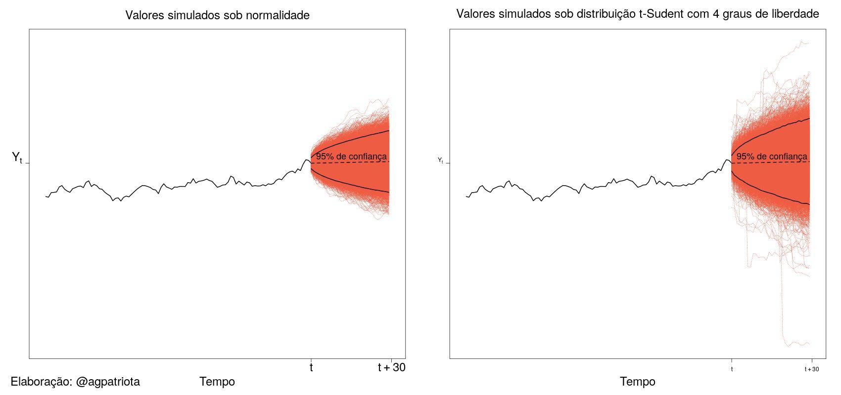Espera-se que 5% dos valores futuros sejam observados fora das bandas de confiança. Quanto mais variabilidade, mais largas serão as bandas de confiança. Além disso, observe que as bandas de confiança sob a distribuição t-Student são mais largas do que as obtidas sob normalidade. Isso é esperado para comportar os valores atípicos dentro das bandas.
